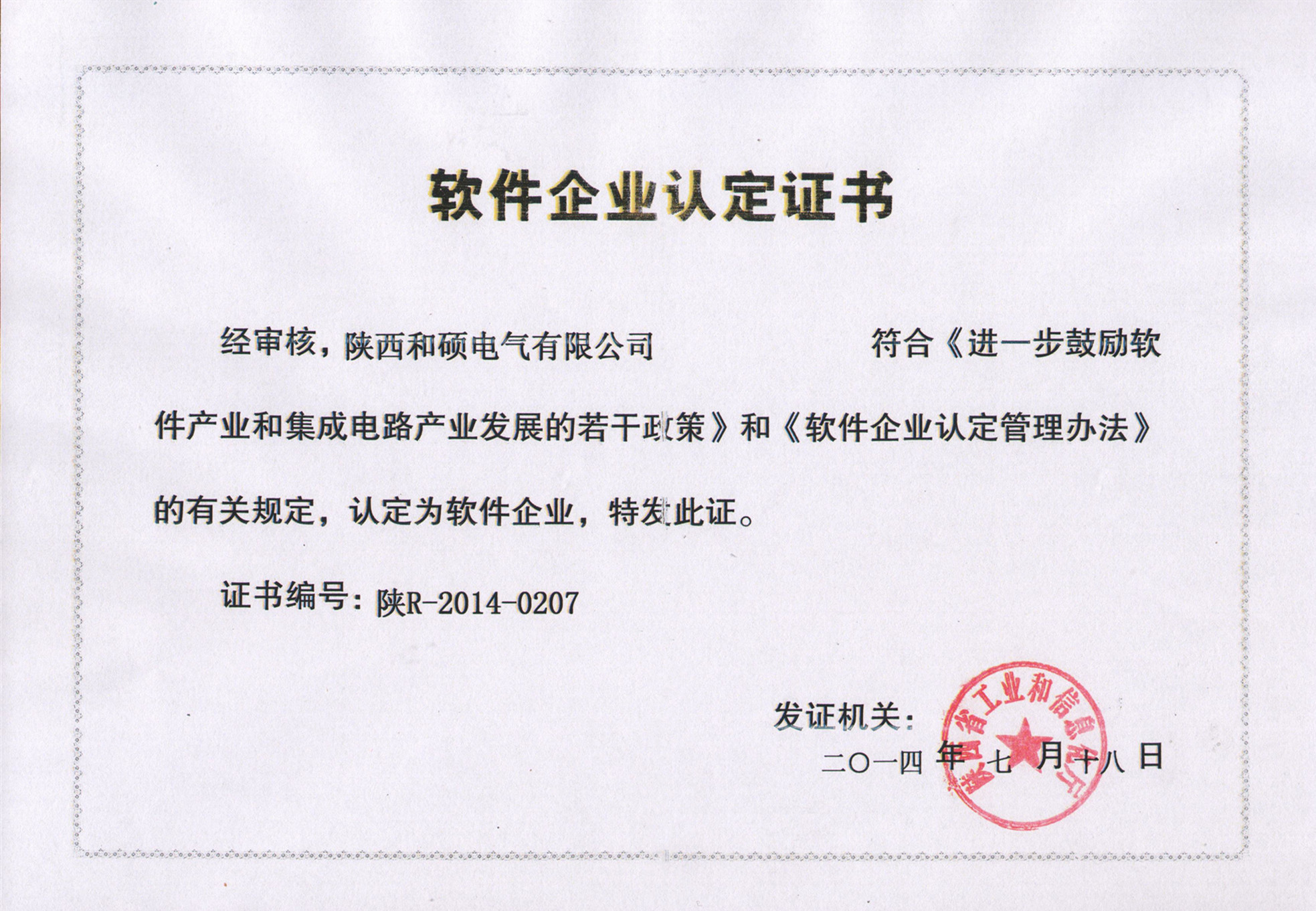 软件企业认定证书